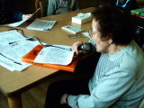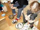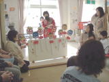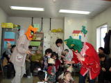 お楽しみ会では「♪納豆納豆ネ〜バネバッ♪」という手遊びや、「豆まき」のうた、マラカスやカスタネット等の楽器を持って「崖の上のポニョ」を歌ったり、すご〜く怖い顔の鬼(託児所の先生の手作りだそうです)目がけて豆まきをしたりと、とっても楽しい時間を過ごしました。