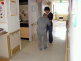 ホームの廊下で歩く練習をしています。一人で転んでしまう危険があるので、スタッフの介助で目的地まで歩行されているところです。