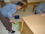 3階の入居者さんがスタッフと一緒に居間の周りを掃除されている様子です。