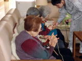 3Fの様子です。誕生会が行われ、プレゼントにスリッパとクッションが手渡され、とても喜ばれていました。入居者全員と