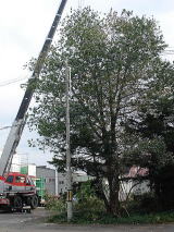 していましたが、残念なことに切る事になりました。クレーン車を使っての伐採です。何十メートル