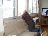 外の工事の音が気になって、ソファに膝をついて窓から外を眺めています。