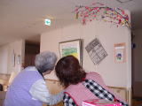 まゆ玉飾りを入居者さんとスタッフで「きれいだね〜」と見上げています。