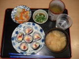母の日の昼食です。巻き寿司・味噌汁・白菜のうま煮・イカオクラです。