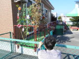 この日は事業所内保育施設いちごの短冊を見に行きました。七夕飾りを見て「キラキラしてきれいだね」