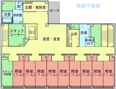 - 1フロア(ユニット)9人が生活します。3フロアー合計27人が入居可能です。